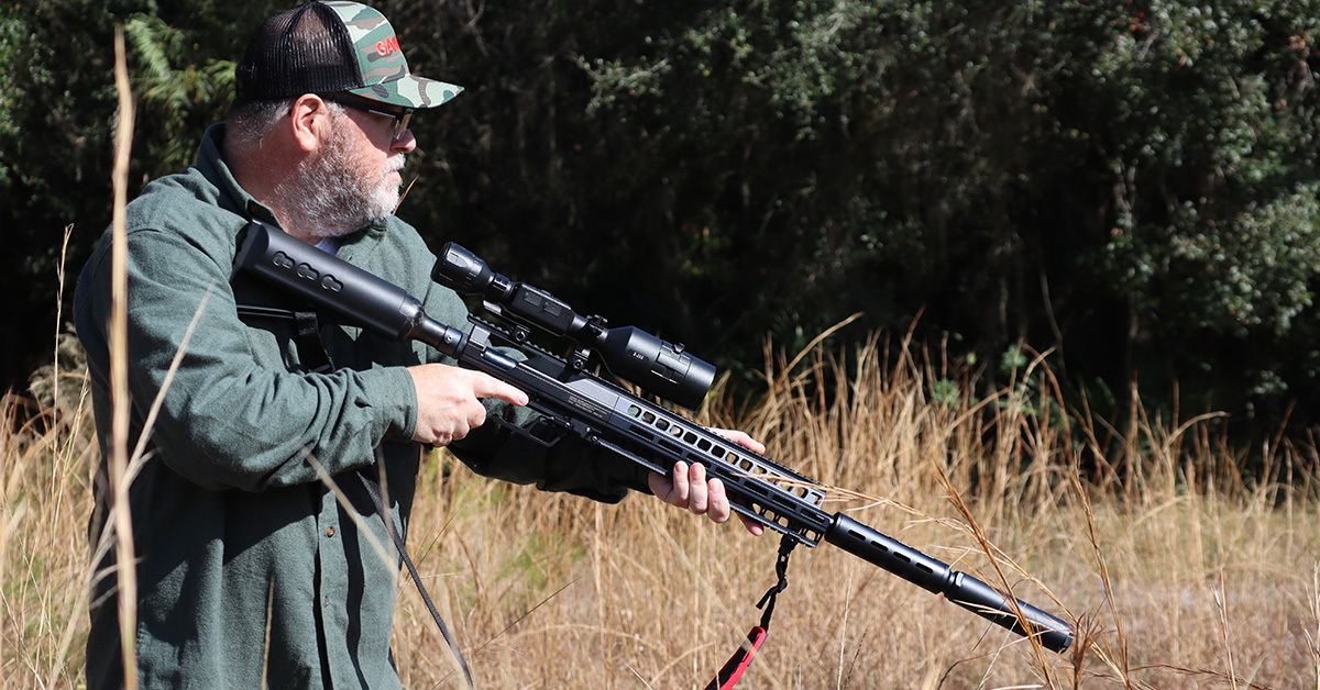The TC-50 featured an ATN X-Sight 4K 3-14 scope with night vision. Knowing we were going to be mainly doing spot-and-stalk hunting at Osceola Outfitters with ranges under 50 yards, I was able to put rounds on paper quickly and keep three shot groups under about an inch and a half.