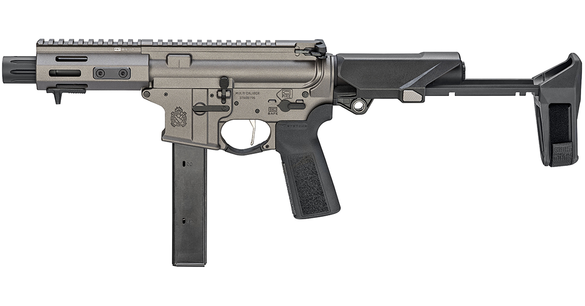 The Saint Victor 5.5″ PDW seen here is a variant of the 5.5″ Pistol already in the Saint Victor line. Both guns are chambered for 9mm, and both utilize a direct blowback bolt operating system. These guns are fed via 32-round Colt-style magazines. The only differences between the two is that the pistol variant is black while the PDW features a Tungsten Gray Cerakote finish, and the PDW comes with SB Tactical’s HBPDW brace.