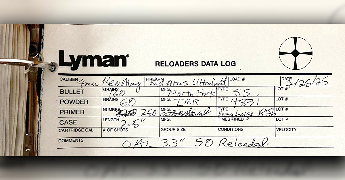 I chose a load a few grains below the maximum from my Nosler reloading manual. That ended up with the 160-grain North Fork bullet sitting on top of 60-grains of IMR 4831. The overall length that works best in my pet MG Arms Ultralight 7mm Remington Magnum is 3.3 inches. Sometimes, when I drop the bolt handle, it is tight, but the accuracy from several different bullet weights and powder loads indicates that’s what the rifle prefers.