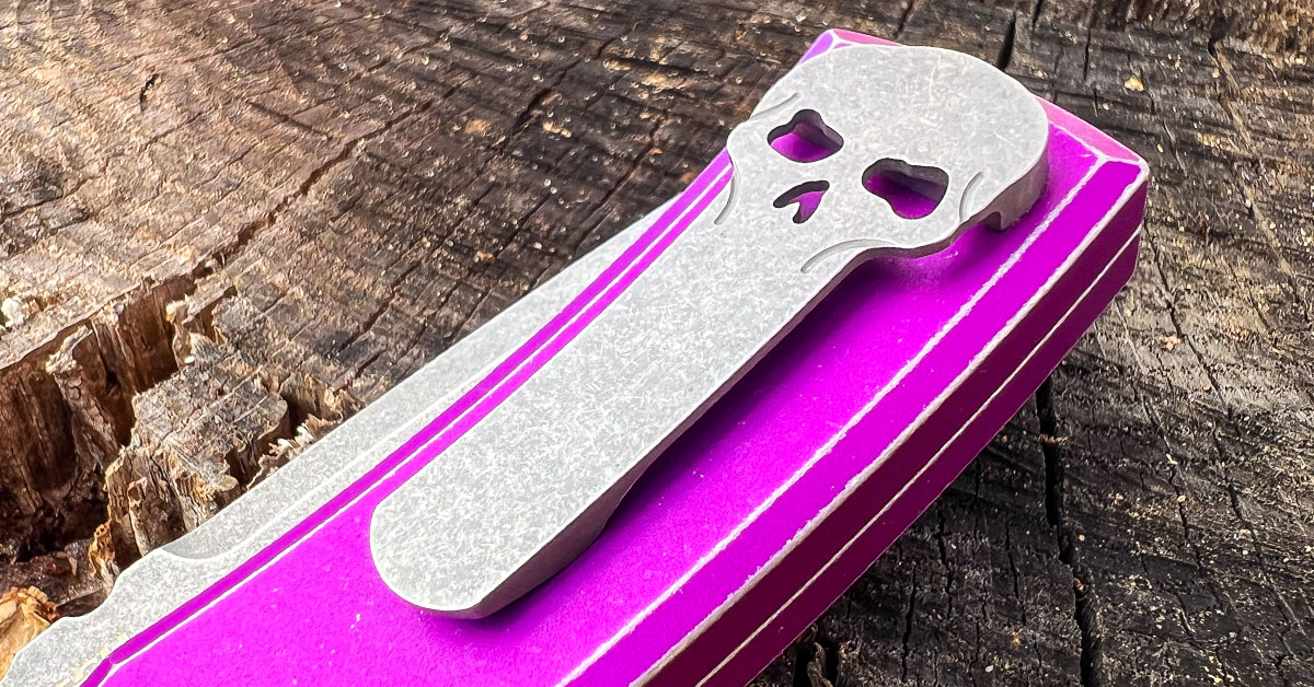 A Chaves Knives signature is their unique milled titanium pocket clip, which is of a skull design. Like it or not, the skull clip does have function to it, as the width allows the clip to be stiffer and more resistant to bending in the event you catch it on something. It does hold the knife in the pocket quite well and not too tight, so there is no struggle to pull the knife out. Another cool thing about the clip is the hidden clip screws. They are inserted into the clip from the inside of the handle. Thus, there are no visible handle screws on the outside. Very cool!