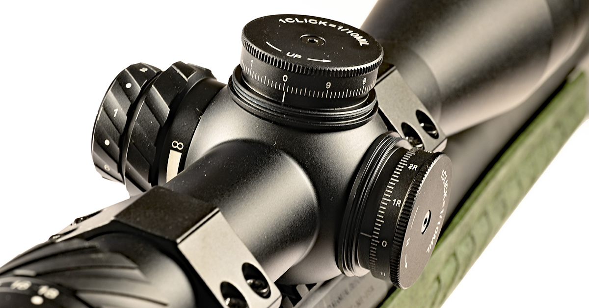 The oversized turrets, which are knurled to provide a good grip, can be easily reset to zero but do not have a hard zero stop. I don’t see that as an issue, as the turrets are capped like those on many hunting scopes. If you wish to employ the scope without the caps and dial corrections, the turrets require enough force to turn that I doubt they would be accidentally turned out of position. In any event, I would likely dial for elevation compensation and just use the reticle to correct for windage. Notably, turret clicks are sharp, tactile, and audible. The scope gets high marks from me for its turrets.