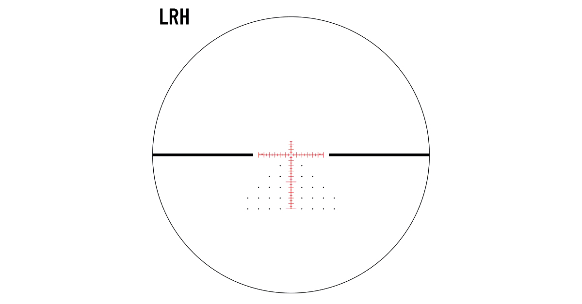 I liked the scope’s somewhat simplified LRH (Long Range Hunter) reticle. It’s a “Christmas tree” design with hash marks on the vertical and horizontal stadia in 0.5 MRAD increments. The reticle provides up to 10 MRAD of vertical holdover and 7 MRAD of horizontal hold to either side of the center aimpoint. At low magnification, the hash marks are not visible, and the reticle functions as a standard duplex. At higher power, the hash marks become visible, but the reticle isn’t so busy as to obscure your view of your target. Illumination lights up the center aimpoint as well as the stadia portions with hash marks, making them easy to see in low light.