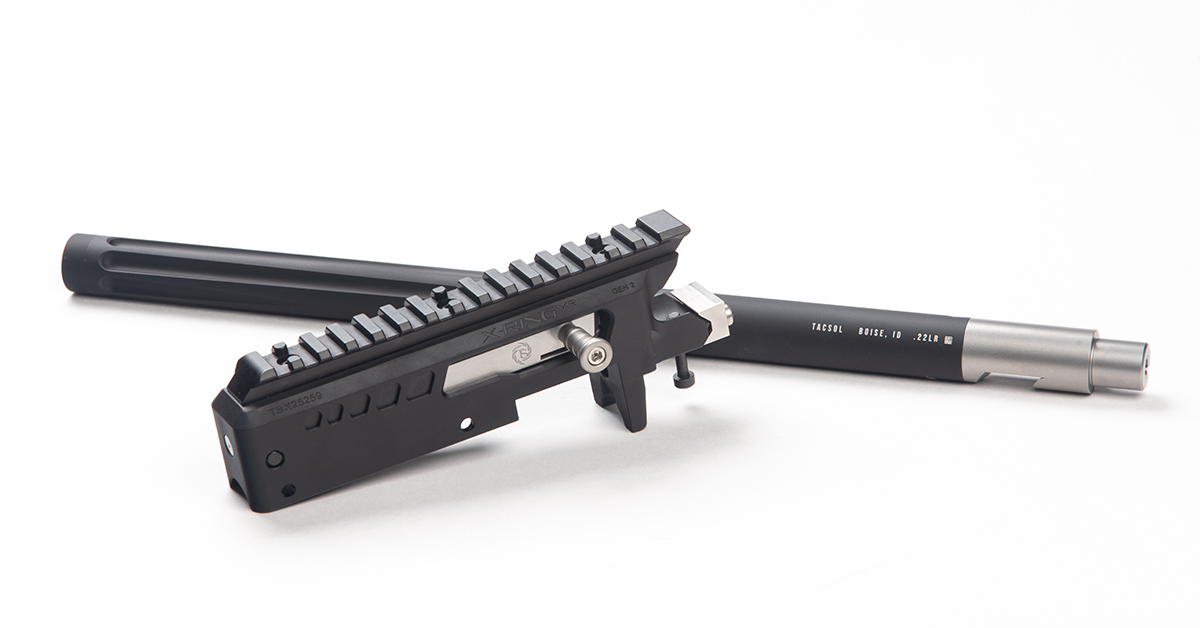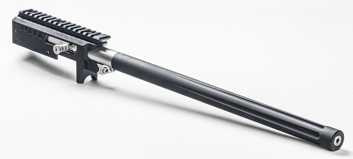 The barrel we chose is the X-Ring Performance HD model. This is quite an interesting barrel and rather complex in its construction, being made for high-volume competition shooting. It is “heavy duty” but not heavy in terms of weight. At its core is a chromoly steel liner surrounded by a beefy aluminum shroud featuring unique tapered fluting along the forward two-thirds of the bull barrel. Barrel diameter is 0.920 inches and the twist rate is 1:16.