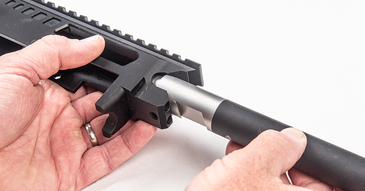 Once you’ve determined proper fitment, lightly lubricate the circumference of the barrel shank and insert the barrel into the receiver. The V-notch in the shank will be oriented to the bottom of the receiver.