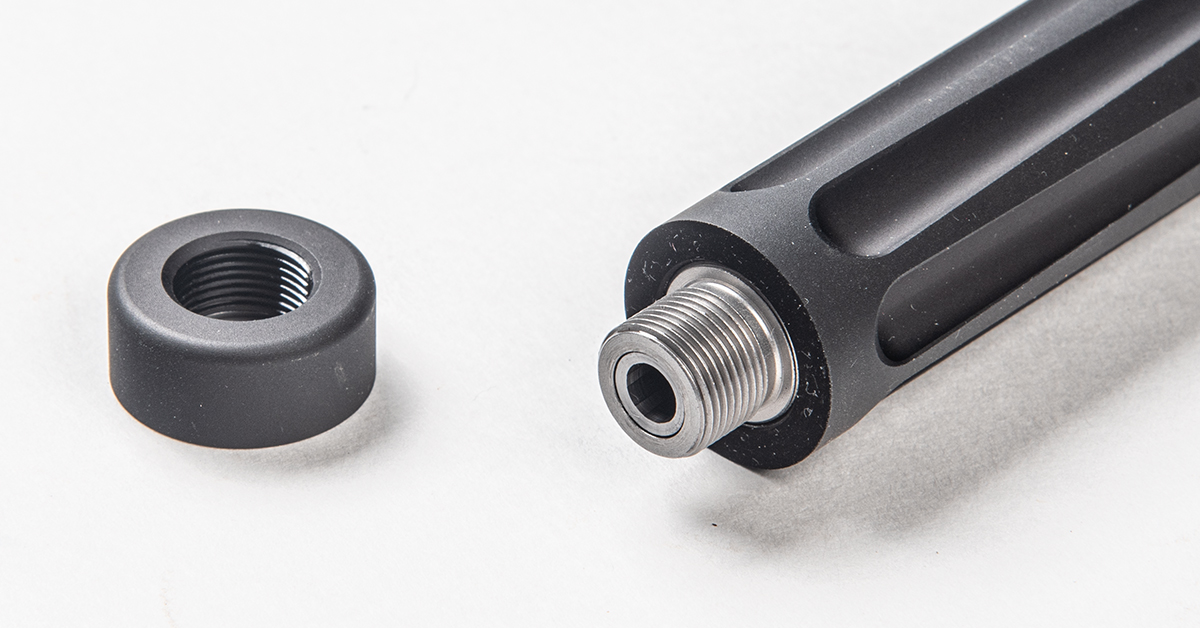The suppressor system is comprised of four parts. The main tube is made of titanium, as is the baffle core, which is 3D printed as a single piece. Also made of titanium is the front cap ring.