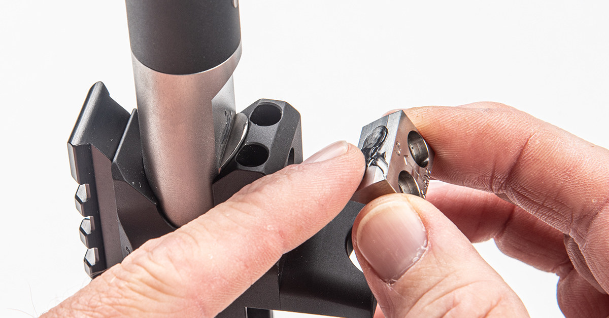 Install the V-block onto the receiver and barrel shank, making sure to align all flats parallel to one another. Apply a light amount of grease to the V-block screws and install them finger tight.