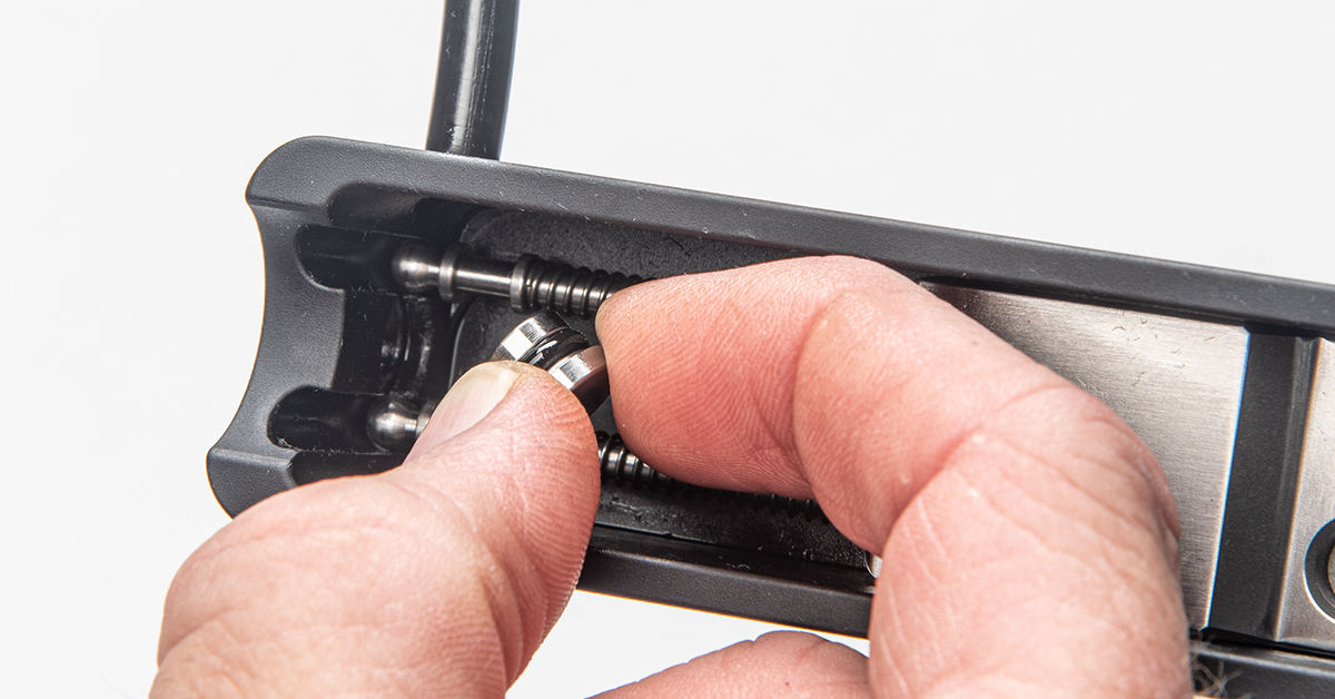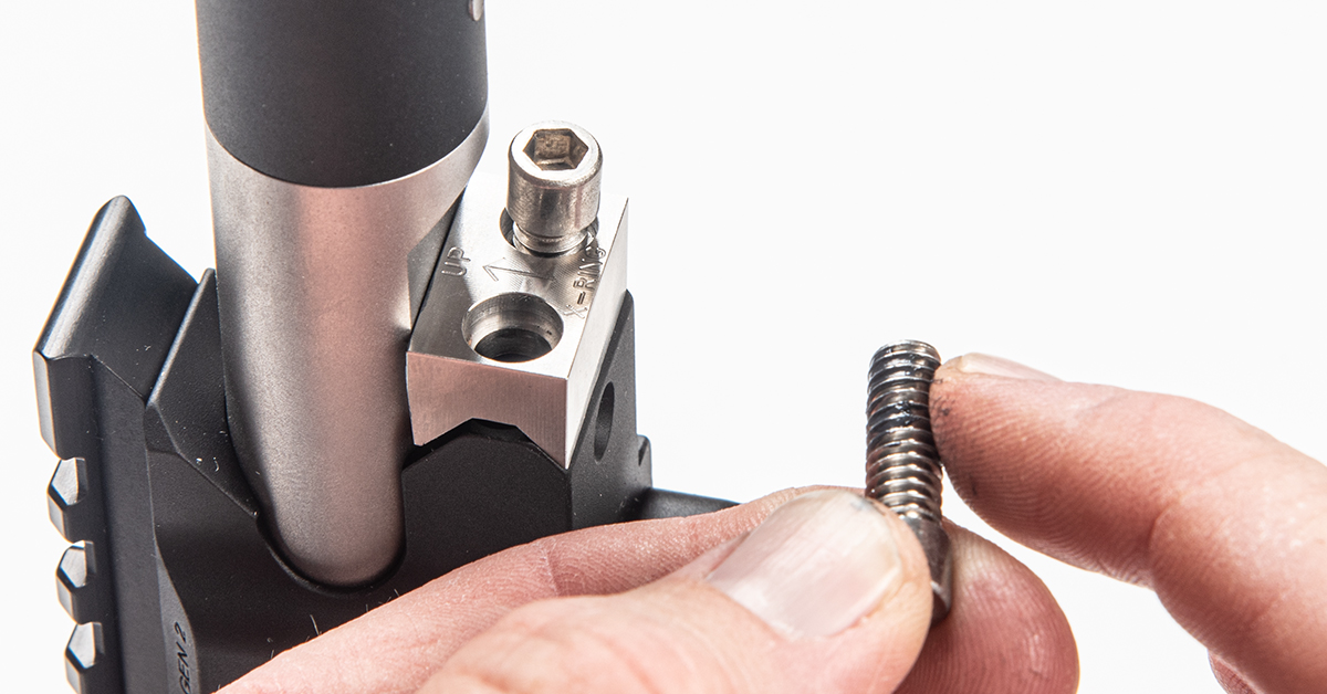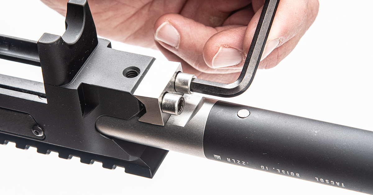 Slowly alternate tightening the screws to ensure even clamping of the barrel to the receiver. Tactical Solutions recommends tightening the screws hand tight with a hex wrench, or snugging them to 18-24 in/lbs.