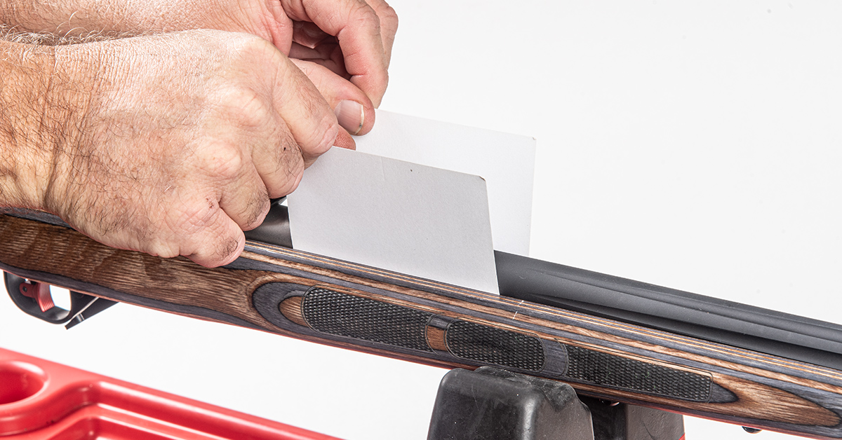 Since this is intended to be a free-floating barrel configuration, use a piece of paper or dollar bill and slide it between the barrel and the stock, beginning at the front and moving back to the receiver. The paper should slide all the way back without interference. Any interference will need to be located and the excess material removed from the stock with a scraper.