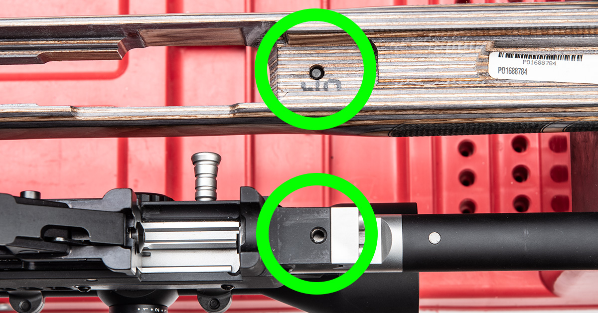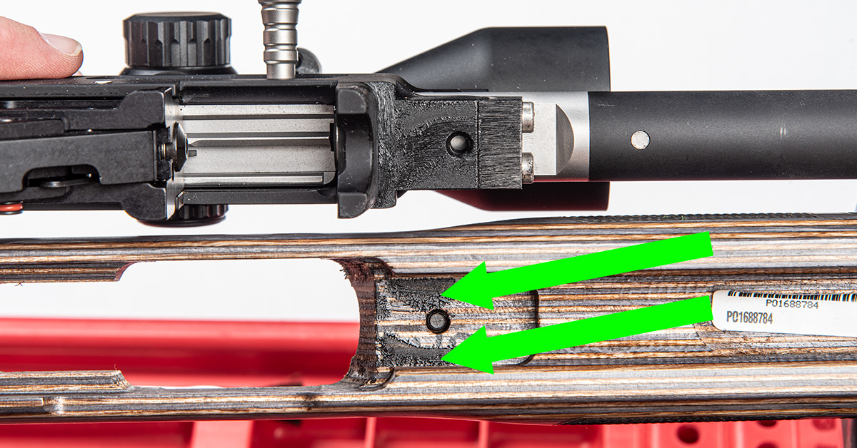The 10/22’s barreled action only secures to the stock with a single action screw. It is important that the receiver sits flat against the stock at this location (circles). If it does not, the receiver may not be properly “grounded” and the result could be that the barreled action will rock under recoil. To ensure a flat mating surface, we use inletting black and a scraper to achieve the desired fitment.