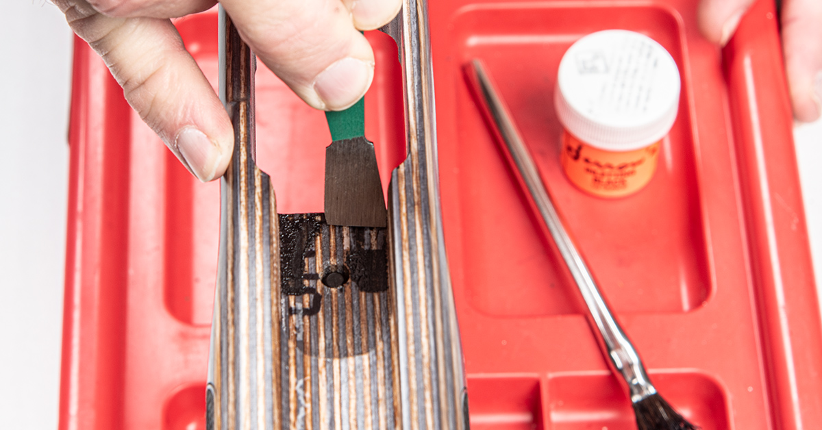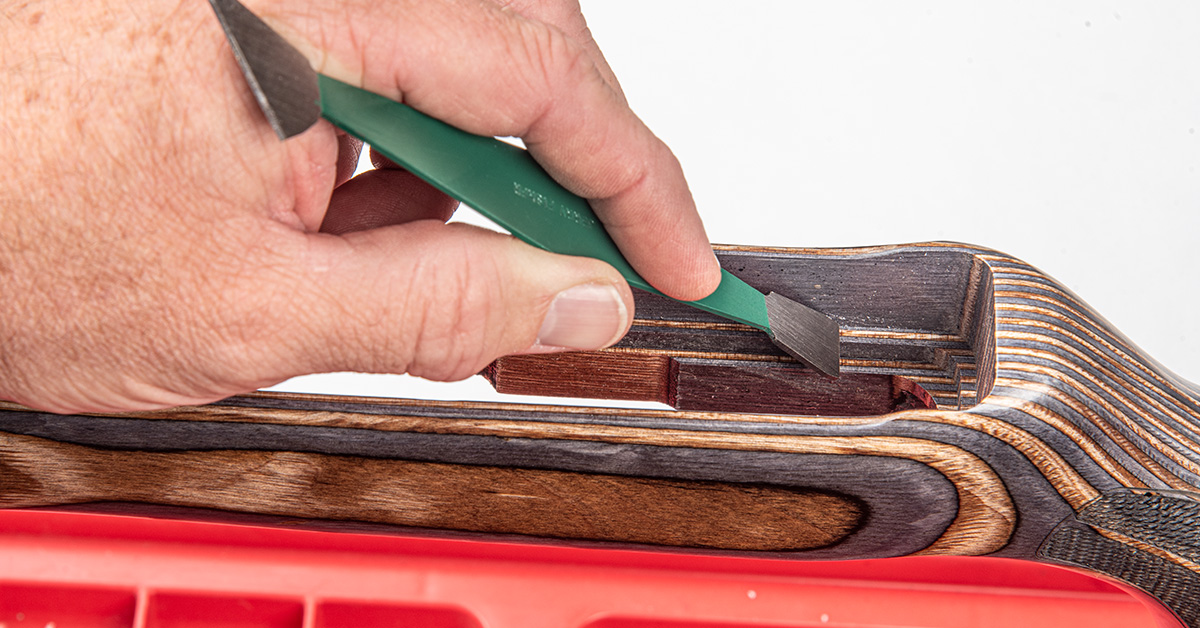 I always begin by smoothing out any end-grain burrs that may have raised up during the stock’s finishing process. A stock scraper, like this one from Jerry Fisher, is the best tool to use for this. Remove any burrs and irregularities from the inletted surface by carefully pulling the scraper toward you. Don’t remove any more material than is necessary and be sure to keep the edge of the scraper flat to the wood.