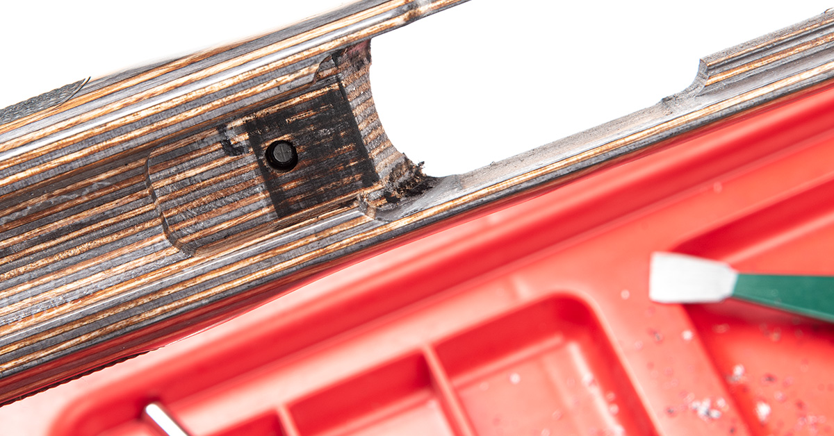 Since the goal is to have inletting black across the entire stock-to-receiver mating surface, it is necessary to remove material from the stock (the high points) where the inletting black transferred. Use the scraper to slowly remove a small amount of material at a time. Once the inletting black and a minor amount of stock material has been removed, repeat the process again. When I say minor, I mean it. In practice, I apply firm pressure to remove the inletting black and just a tad of what’s underneath. That’s it. This is a slow and methodical process.