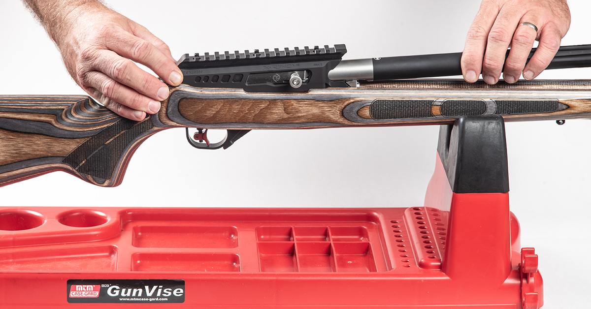 Tools needed for this project are minimal. Real Avid has the hex bits, in/lb torque wrench, and punches (optional in most cases) that I used. A workpiece support is also essential. For that, I heartily recommend MTM-Case Gard’s Gun Vise. The Gun Vise is a simple gun cradle with a locking lever for the stock. It performs well for most long gun work, such as cleaning, scope mounting, or…building that perfect custom 10/22. With its light weight, you can take it anywhere you have a flat surface to work on.